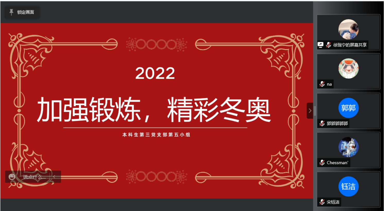 第24届冬季奥林匹克运动会计划于2022年2月4日开幕。为了解冬奥会,学习习近平同志“坚定信心再接再厉抓好各项筹备工作确保北京冬奥会冬残奥会圆满成功”讲话精神,2022年1月24日晚,欧美av 本科生第三党支部召开“加强锻炼,精彩冬奥”组织生活会,本次会议由徐珑宁同志主持,支部全体党员、预备党员和积极分子参会。