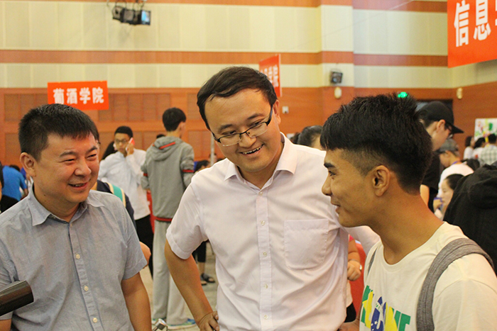 校党委书记李兴旺亲切问候独自一人来校报到的维族学生阿德尔江·阿布来提