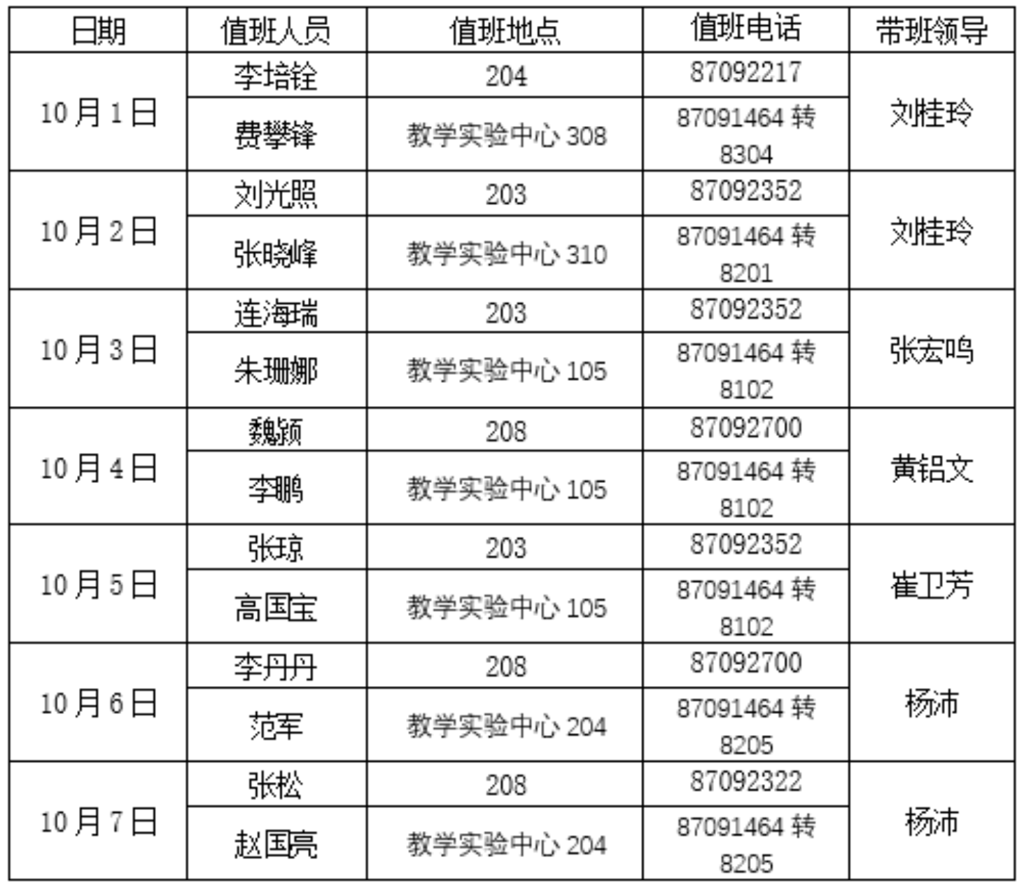 3.办公室、实验室安排值班,值班时间为上午 8:30-11:30,下午 2:30-5:30。具体值班安排如下: