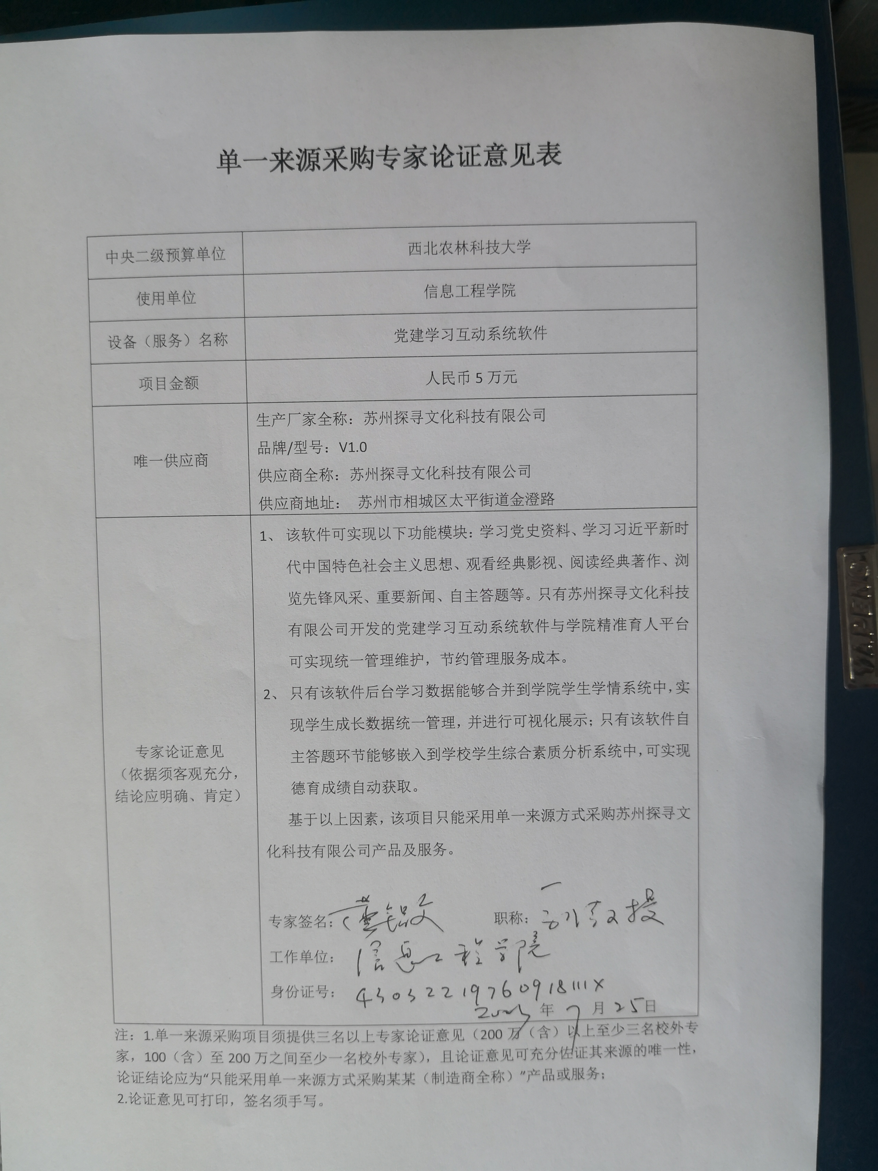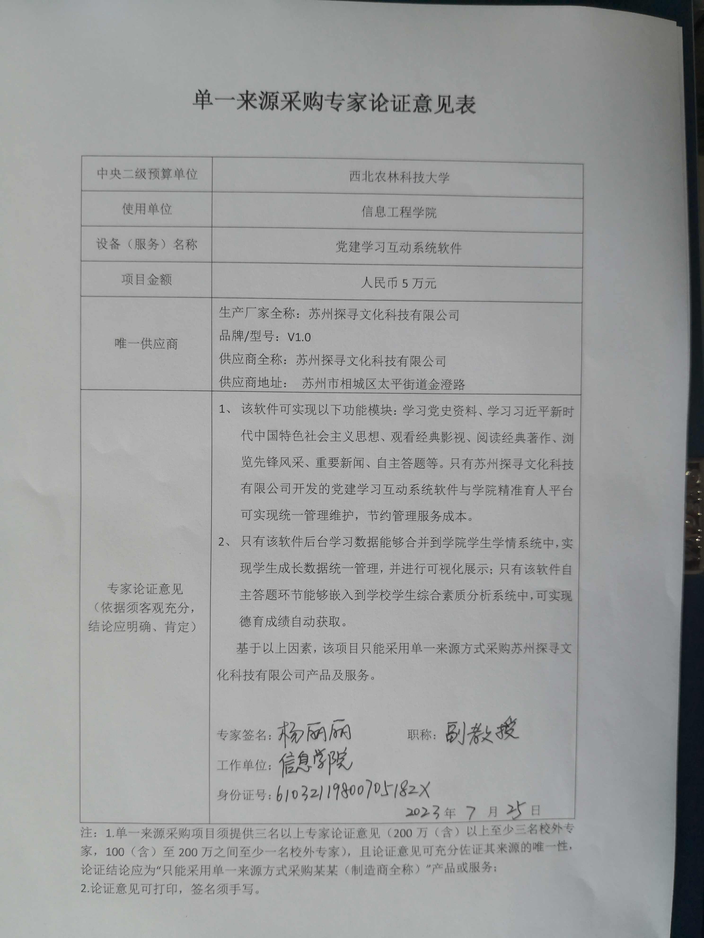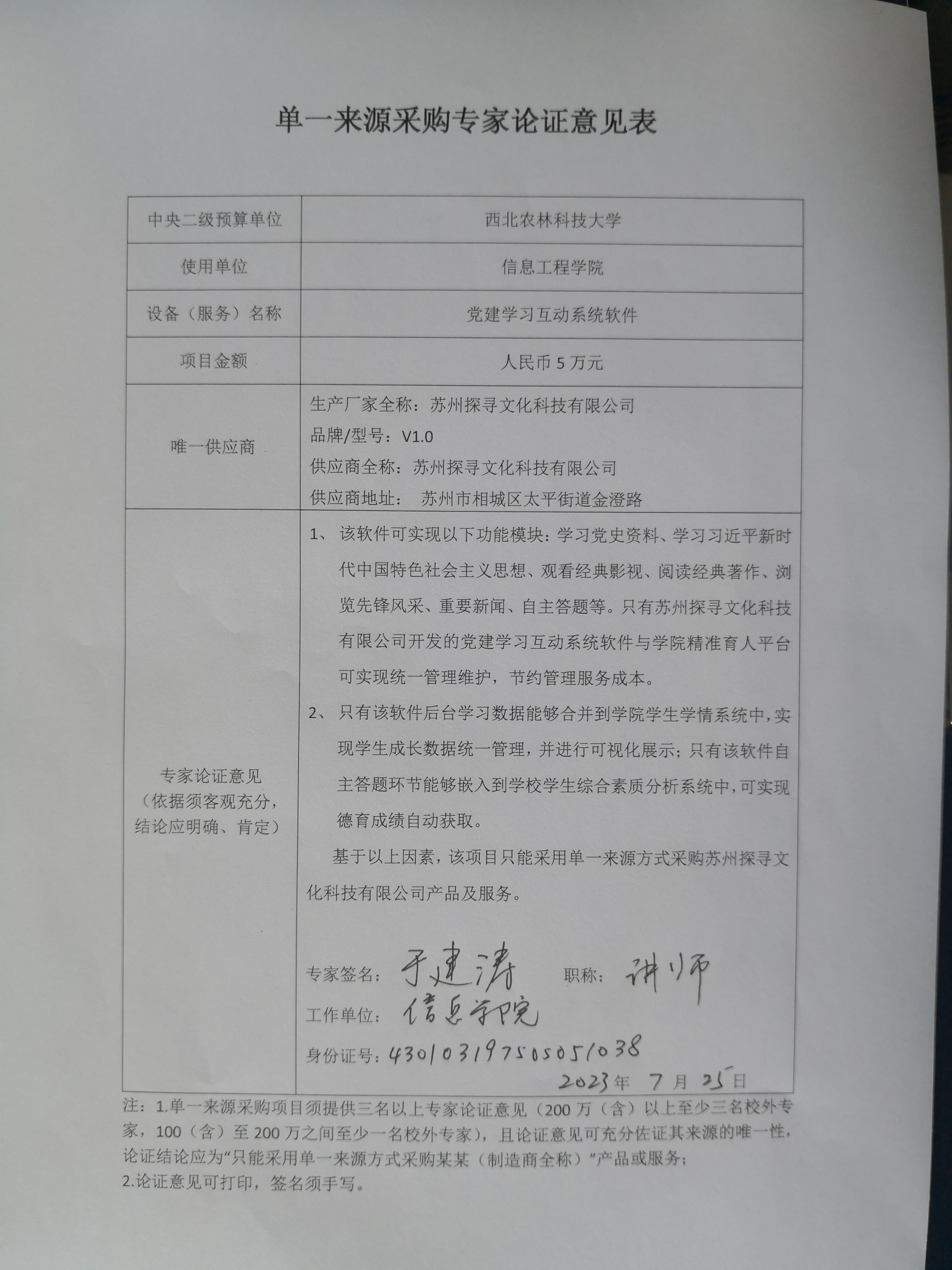 附件: 单一来源采购专家论证意见表
