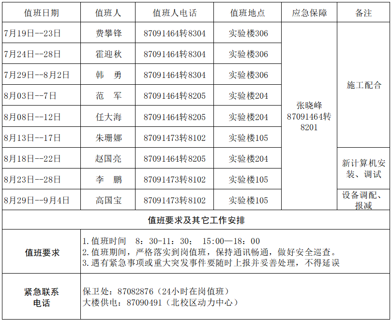 暑期实验室全面施工,不对外开放,值班安排如下:
