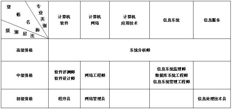 三、考试专业、级别与资格:共设三个级别、四个专业、十种资格(见下表)。