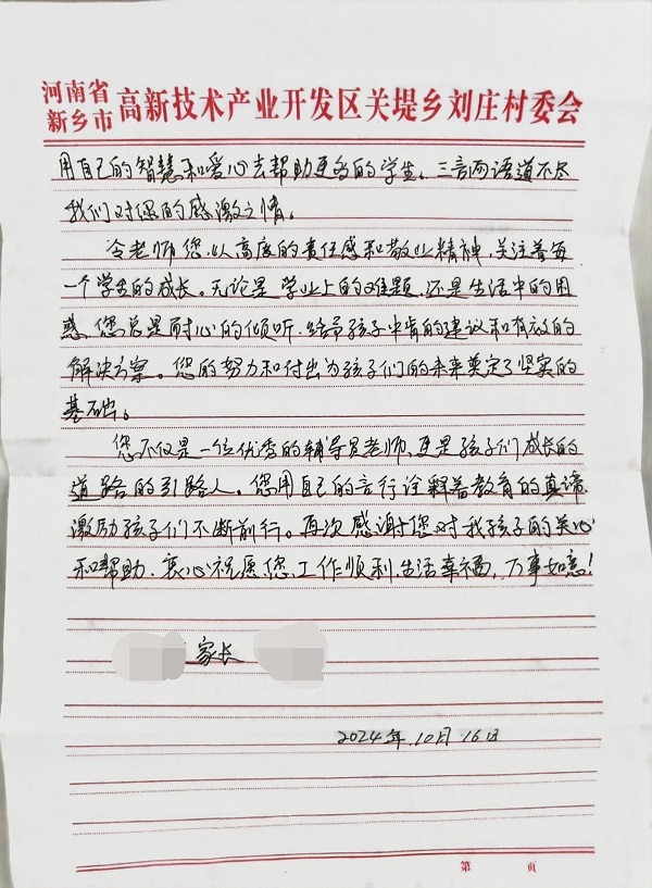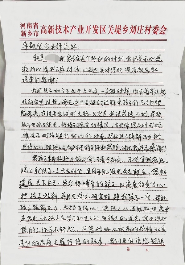 “令阳老师在凌晨放下自己一岁多哺育的孩子,毅然前来帮助我的孩子。您不仅是一位优秀的辅导员,更是孩子们成长路上的明灯,您用言行诠释了教育的真谛,激励孩子们不断向前!”近日,欧美av 收到了一封感人至深的感谢信,信中2021级软件小唐(化名)的母亲用朴素平实的语言讲述了,欧美av 辅导员令阳对其孩子无微不至的关怀和照顾,字里行间满是感激之情。