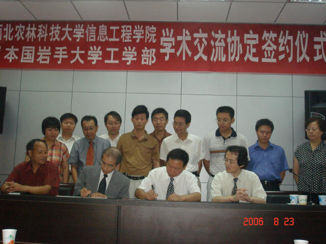 致欢迎词。随后,何东健院长代表我院,马场守部长代表岩手大学工学部双方进行正式签约并合影留念。协议约定如下:双方在信息科学、工学领域进行交流与合作。包括:共同研究与学术论文等的共同出版;双方就感兴趣之学术领域进行信息互换;为了推进学术研究,双方互派研究者、学生等。