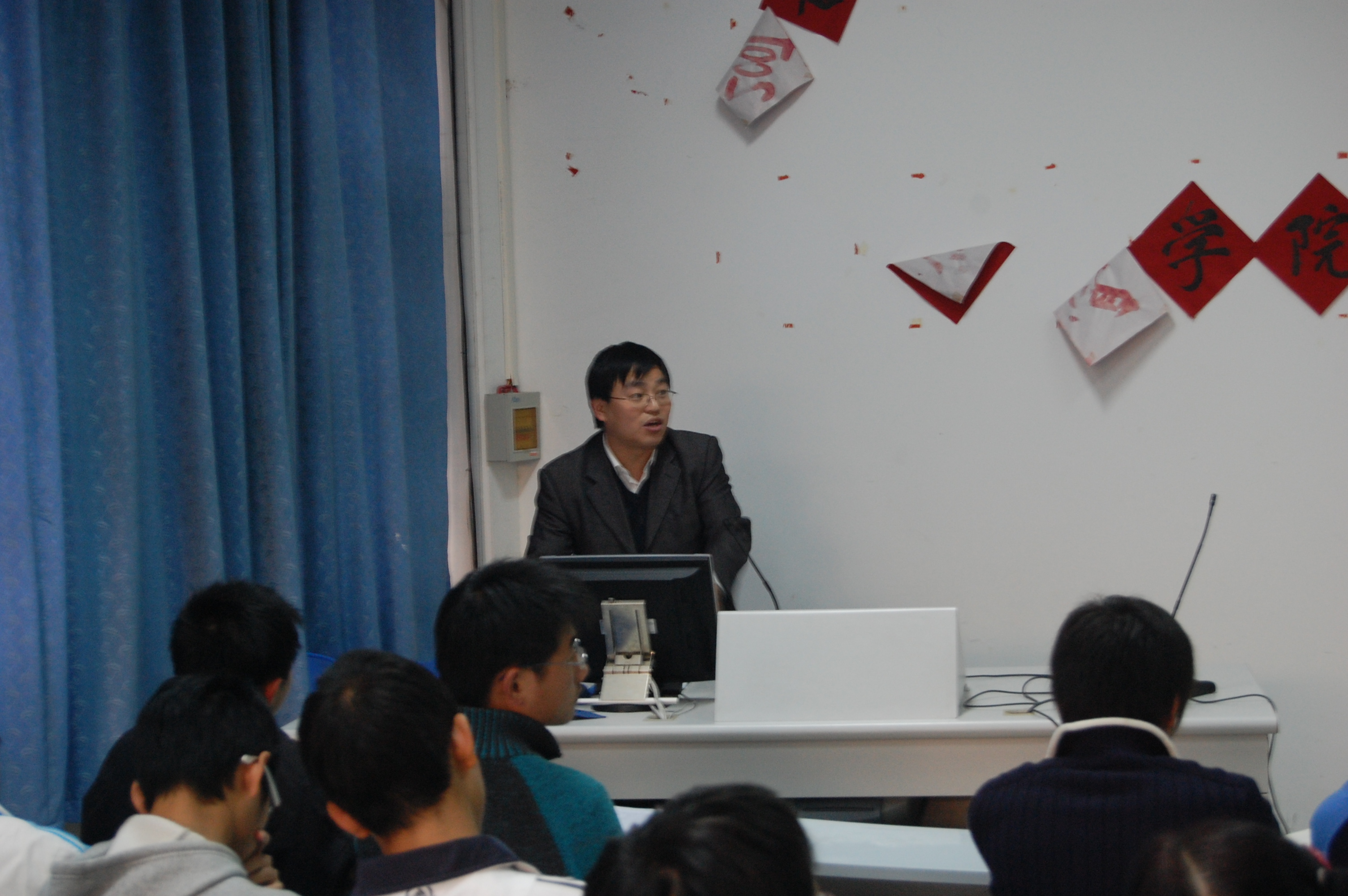 张老师就大学生的基本特点及表现、学生干部的角色定位、干部应强化的几种意识、做有魅力的领导者四个方面做了精彩地讲授。他对当代大学生作了精辟的分析,他说当代大学生政治思想健康,时代感强;道德价值取向多元化,社会认同感强,践行能力弱;参与意识、民主意识强,自我评价和社会认识能力弱;主体意识、自主意识强,集体观念和合作能力弱;个性特征强,承受能力弱,身心健康问题突出;同时运用周济同志讲话的启示提出如何培养团学干部的爱国主义情操。另外,张老师指出,团学干部要找准自己的角色位置,扮演不同的角色,发挥不同的作用。在锻炼自己的同时,成为学校教育管理中一支强大的力量。最后,他提出了高校学生干部的标准—— “老师放心,同学满意”。