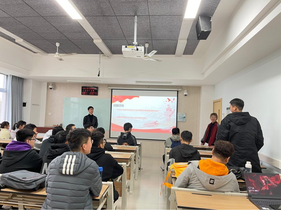 组织委员宋德轩就学校方面、班级方面和学生个人方面展开了此次班会讨论。随后抛出几个学风问题,让同学们有了高涨的参与互动感,同时,也积极带动了同学们对未来自我规划及为班级班风建设的思考。